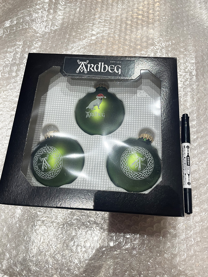 Ardbeg (アードベッグ)ロゴとショーティーが印刷された クリスマスオーナメントです。 3個1セットです。 箱サイズ 高さ約6.5cm
