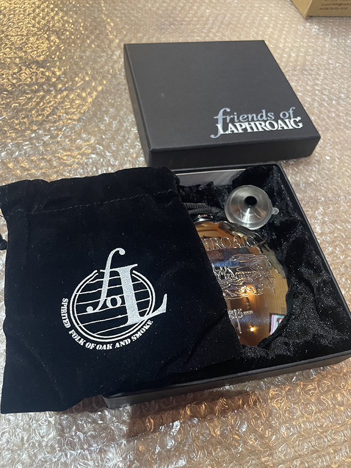 Laphroaig(ラフロイグ)蒸留所のステンレススキットルです。 ロゴタイプと蒸溜所がエンボス加工してあります。ふくろ、ケース付き。