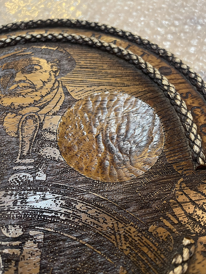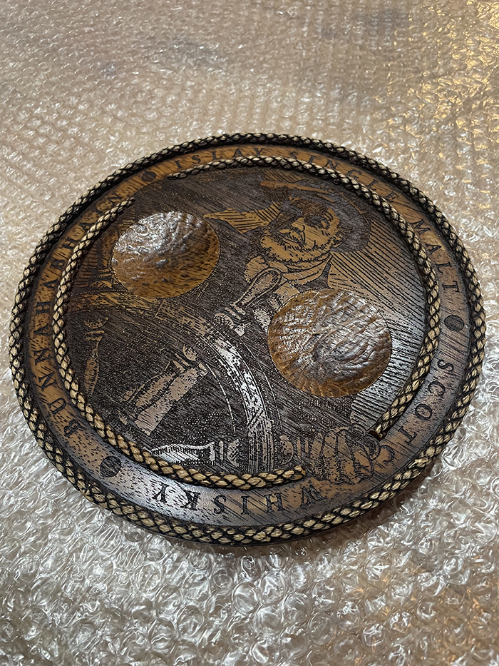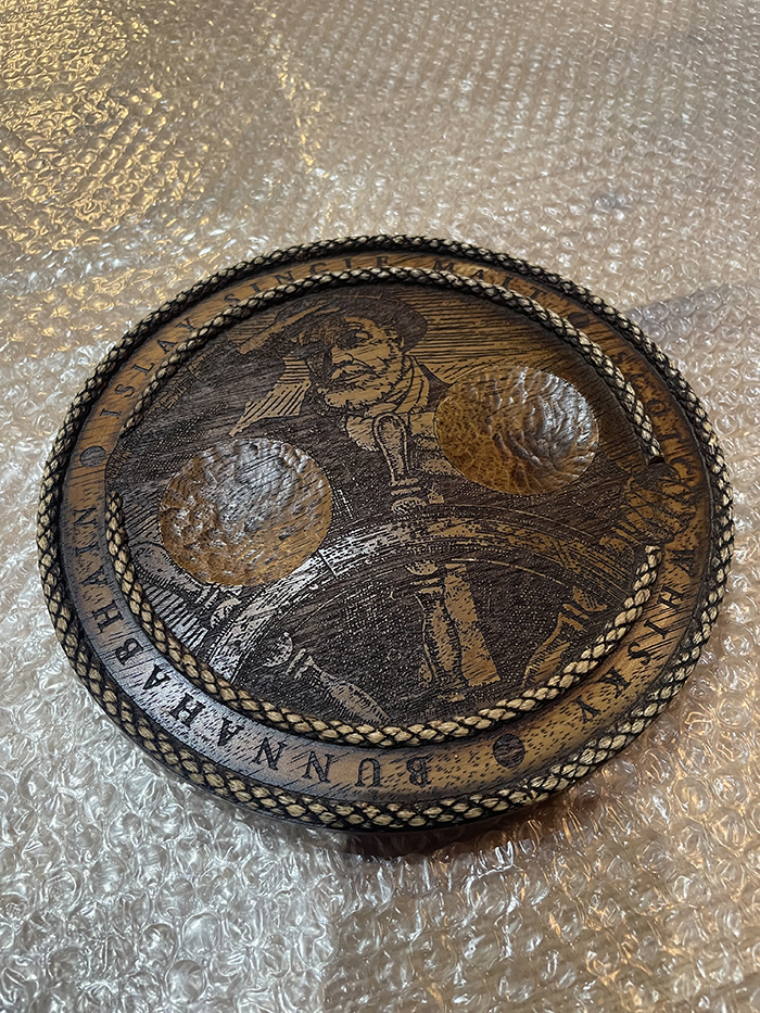 ブナハーブンの象徴的なトレードマークの船長(ヘルメスマン(操舵手)」と呼ばれています。)のイラストがレーザー加工で彫られている丸グラス置きです。木製で重厚感があります。