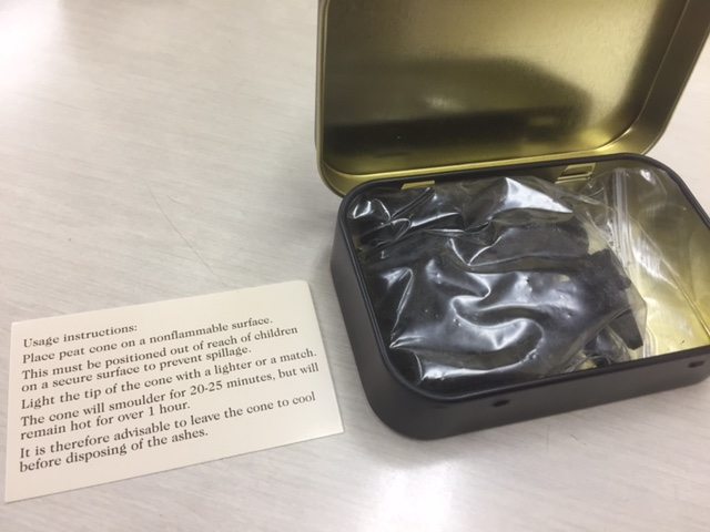 泥炭でできた香のようなもの。火をつけてお香のように香りを楽しみます。ケースもアードベッグオリジナルでオシャレです。ロゴ付の専用台座付。どんどん希少になっていきます。コレクターの方いかがでしょうか。