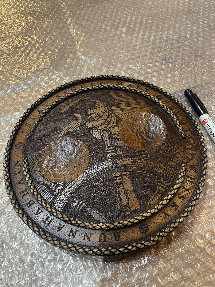 ブナハーブンの象徴的なトレードマークの船長(ヘルメスマン(操舵手)」と呼ばれています。)のイラストがレーザー加工で彫られている丸グラス置きです。木製で重厚感があります。