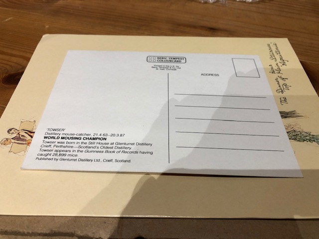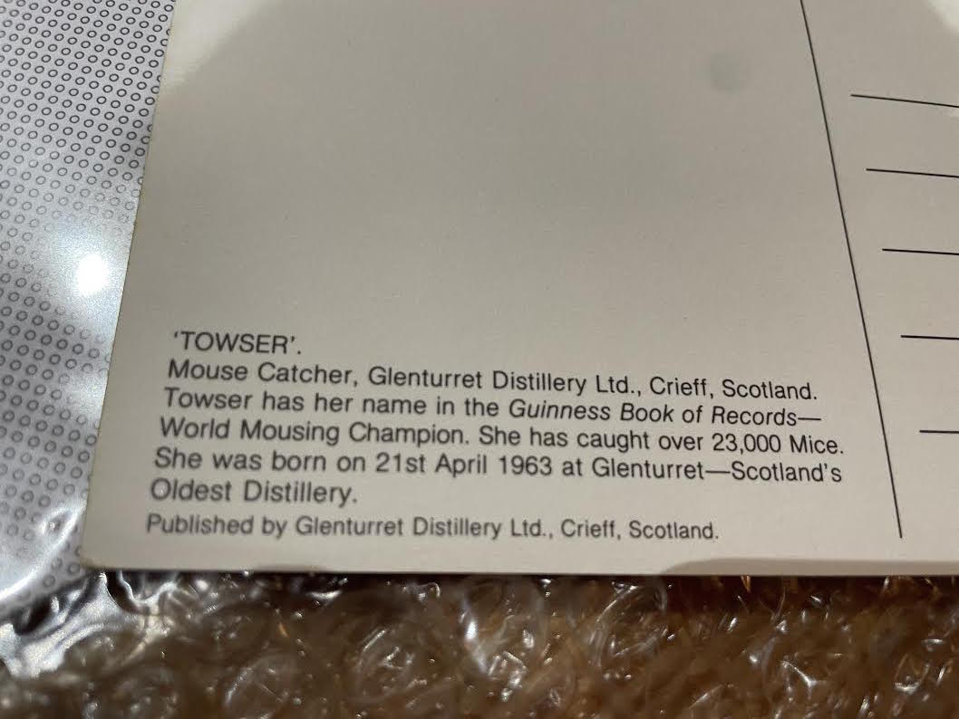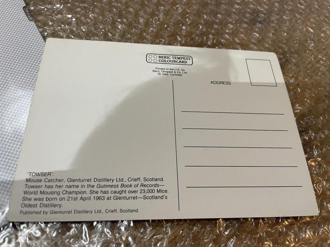 世界で最もネズミを捕獲したというグレンタレット蒸留所のタウザーの写真の絵はがき。こういったなにげないものほど、コレクターがいなく、市場に出にくいものなので非常にめずらしいものです。
