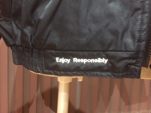 胸、左腕、裾にenjoy responsiblyの刺繍