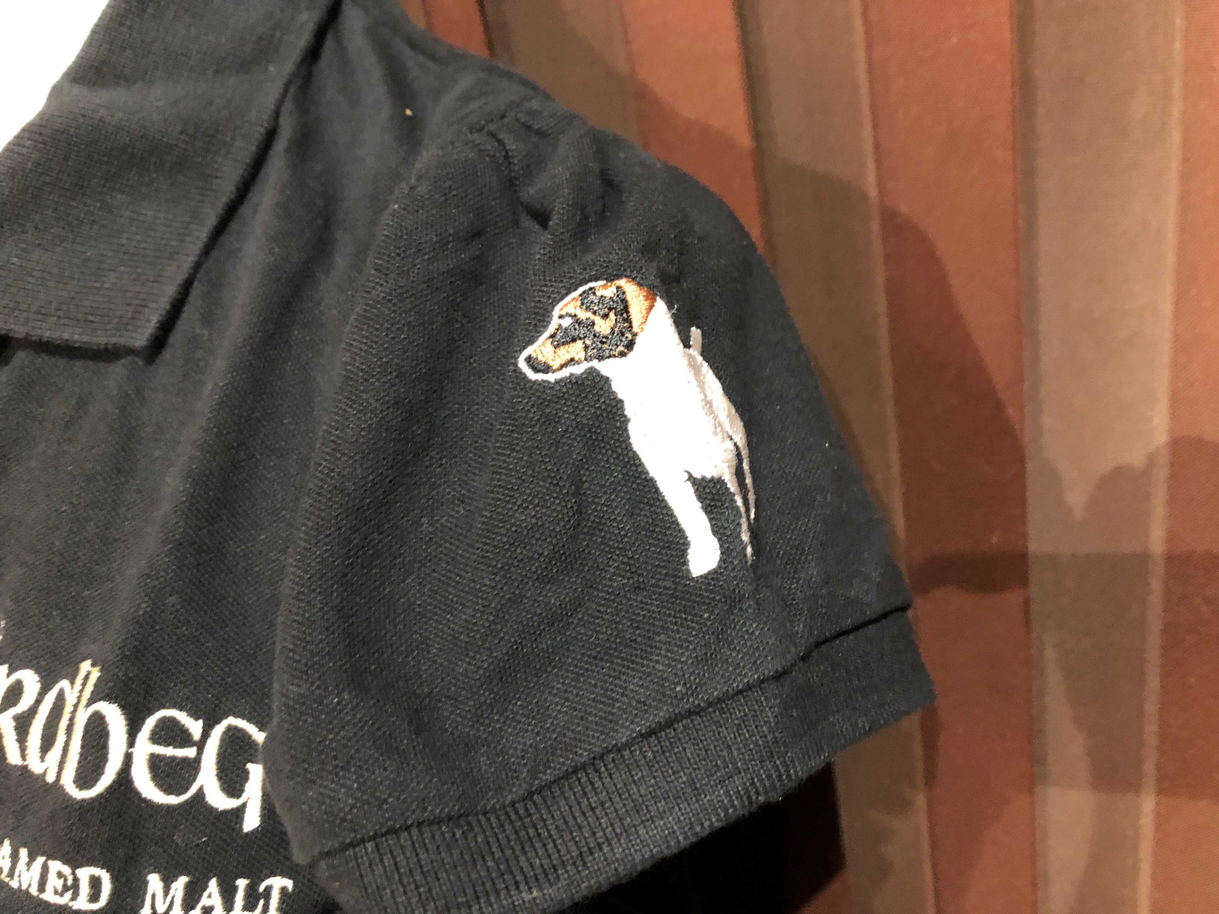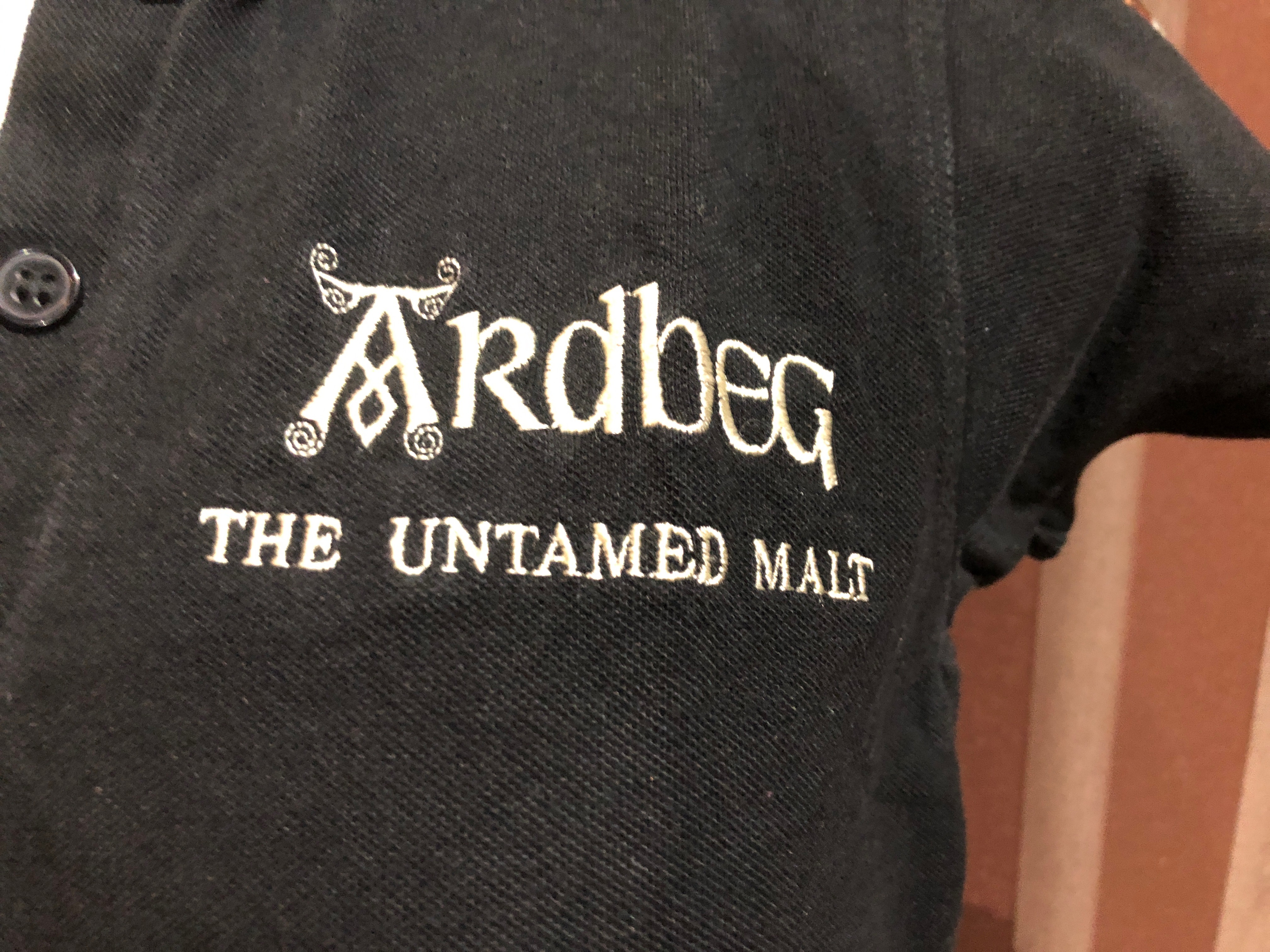 アードベッグのレディースMサイズのポロシャツです。 胸にロゴ、腕にショーティーの刺繍があります。 半袖がパフスリーブっぽい感じです。