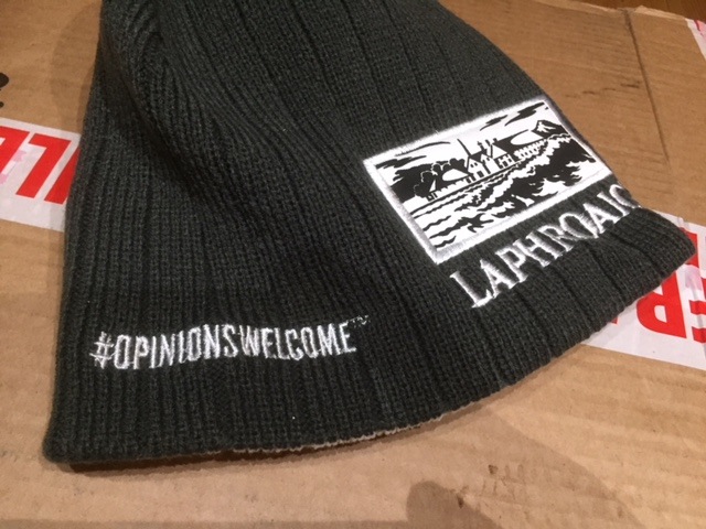 laphroaig(ラフロイグ)ビーニーハットです。リバーシブルになってて、グレーの反対側は白になっています。なかなかよくできています。刺繍もところどころにあってこだわりがありオシャレです。