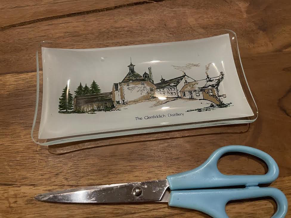 グレンフィディックのガラスのトレイです。蒸留所のイラストが印刷されています。