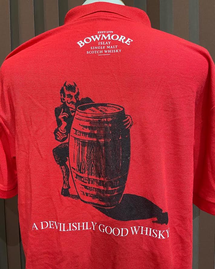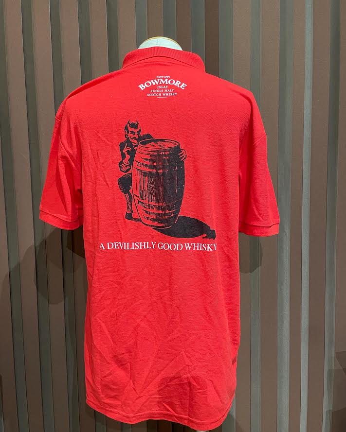 ボウモアのデビルズカスクのポロシャツ。サイズLです。 イギリスサイズのLです。 胸のモチーフもなかなかですが、裏面のプリントもなかなかです。