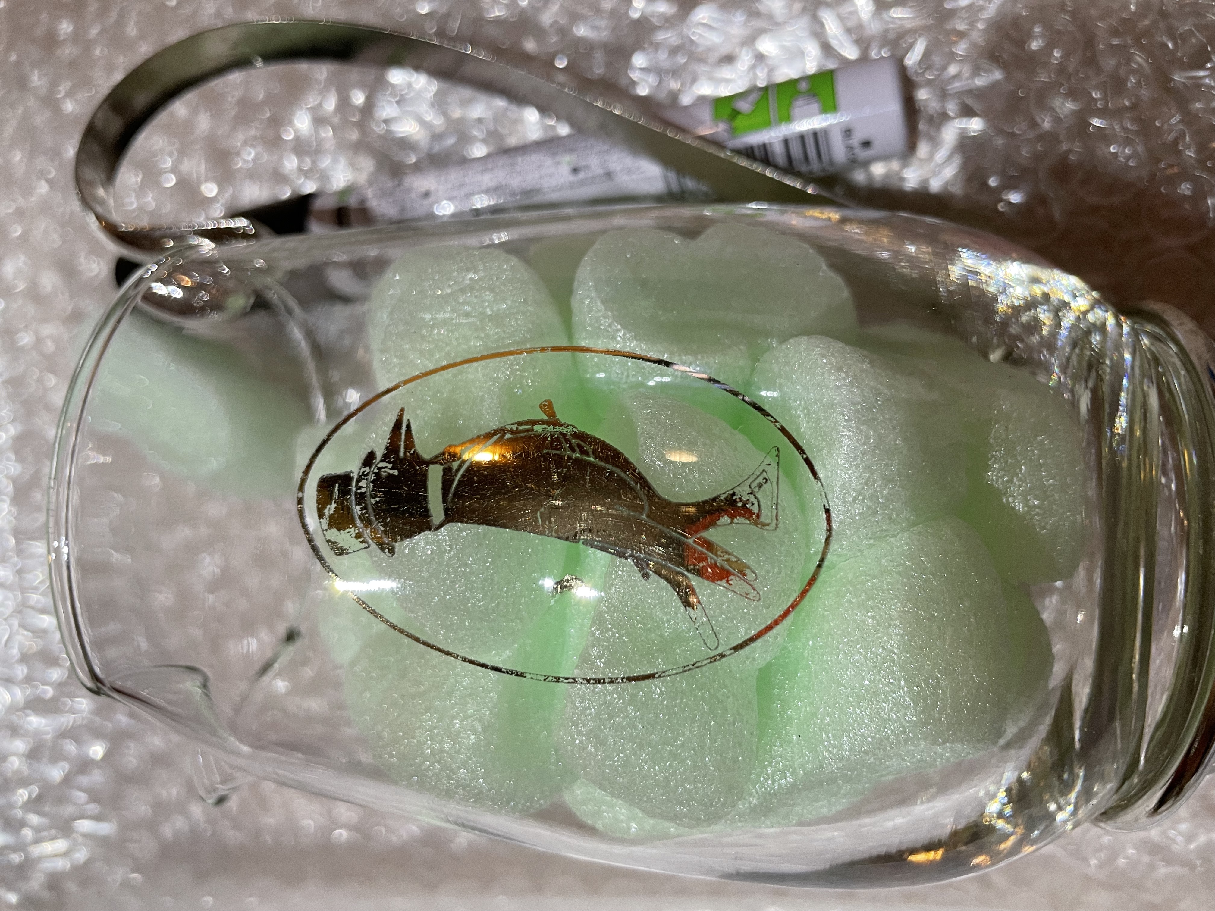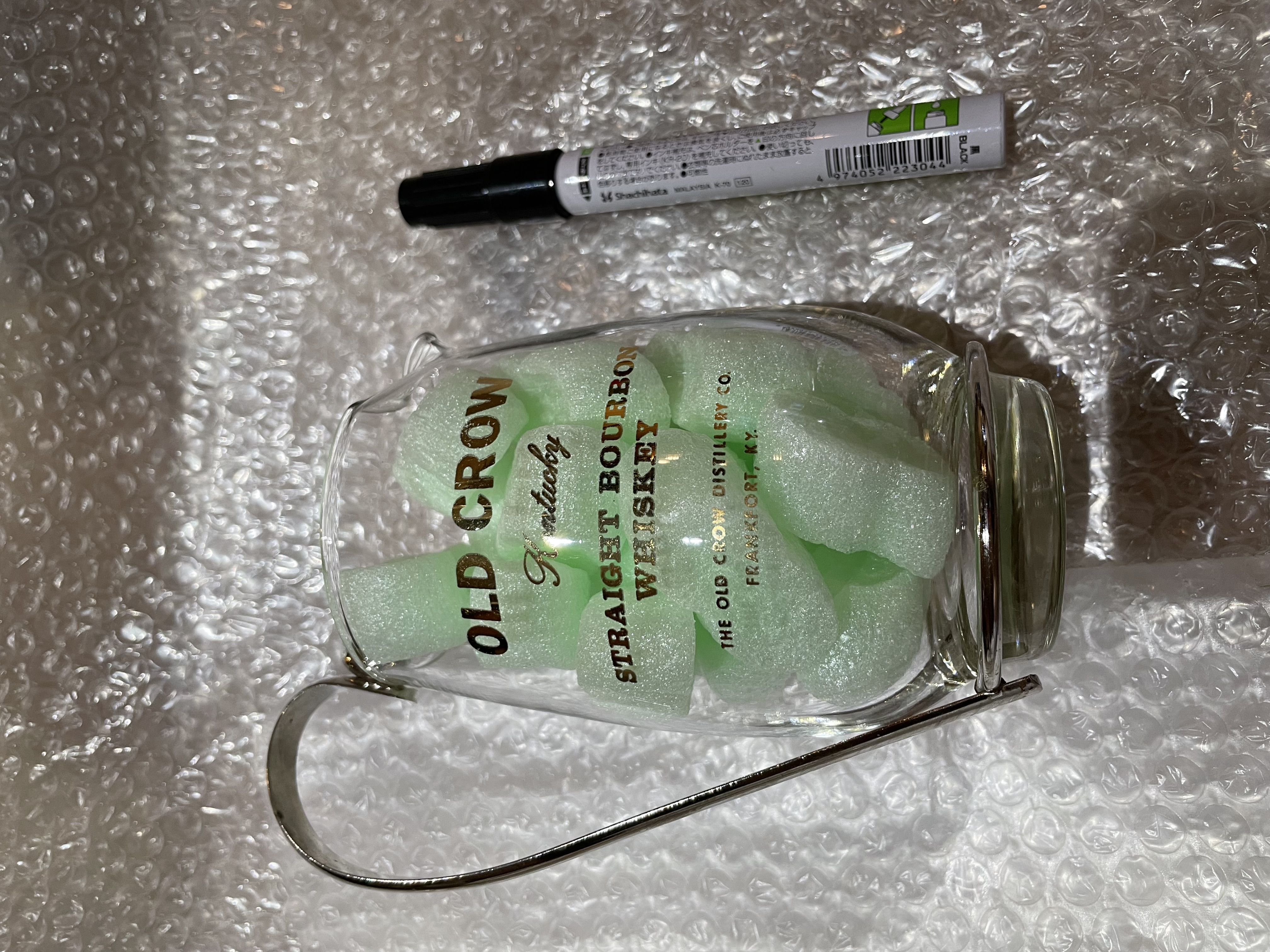 中古のOLD CROW(オールドクロウ)のウォータージャグです。 カラスのイラストが金でガラスに印刷されています。