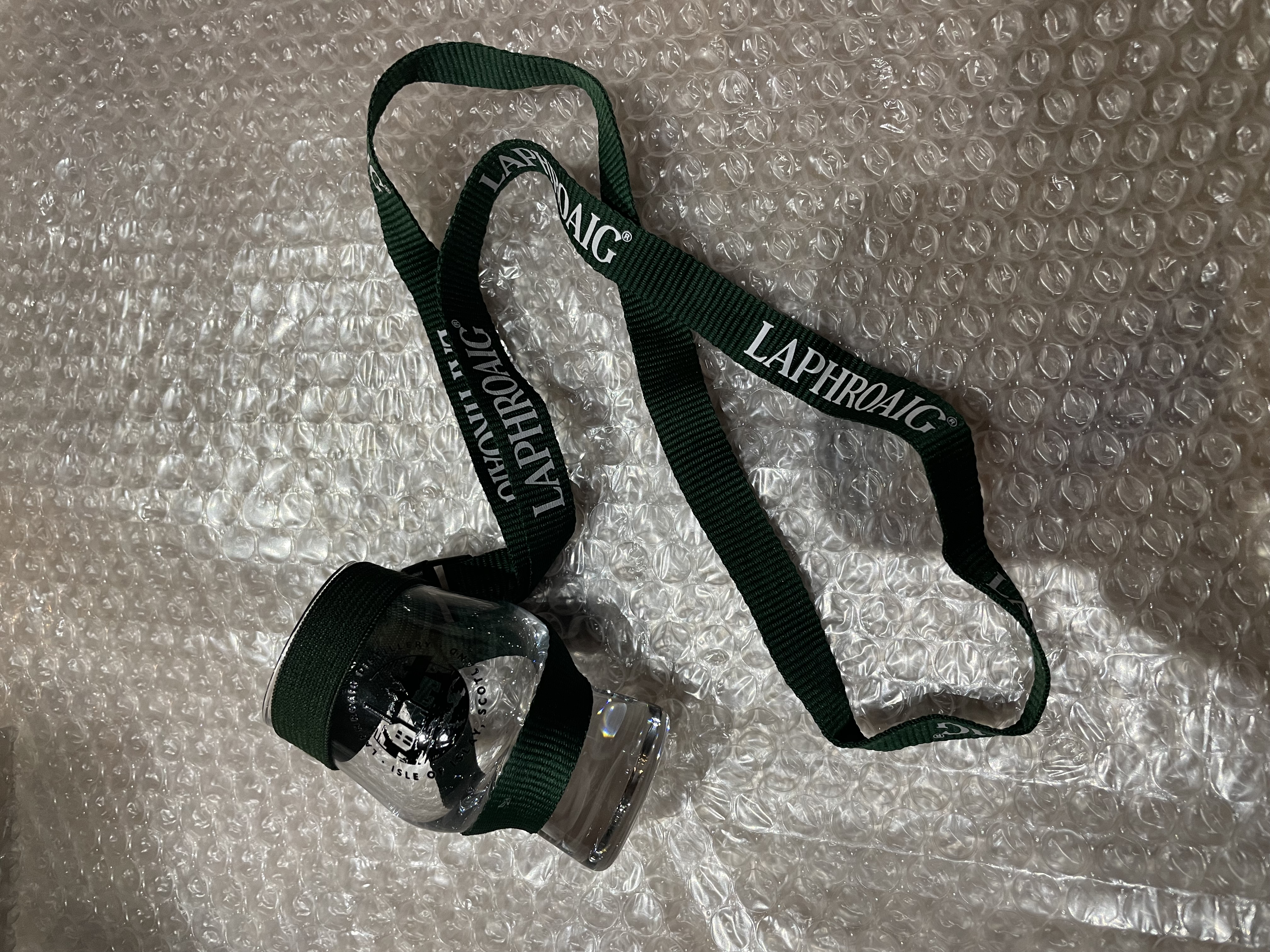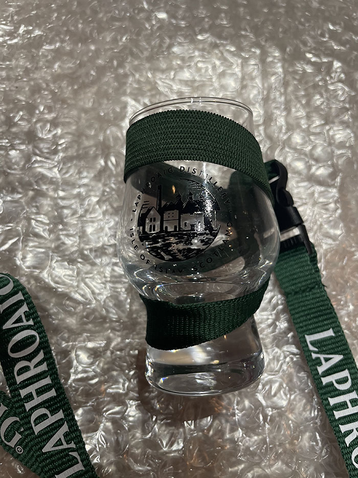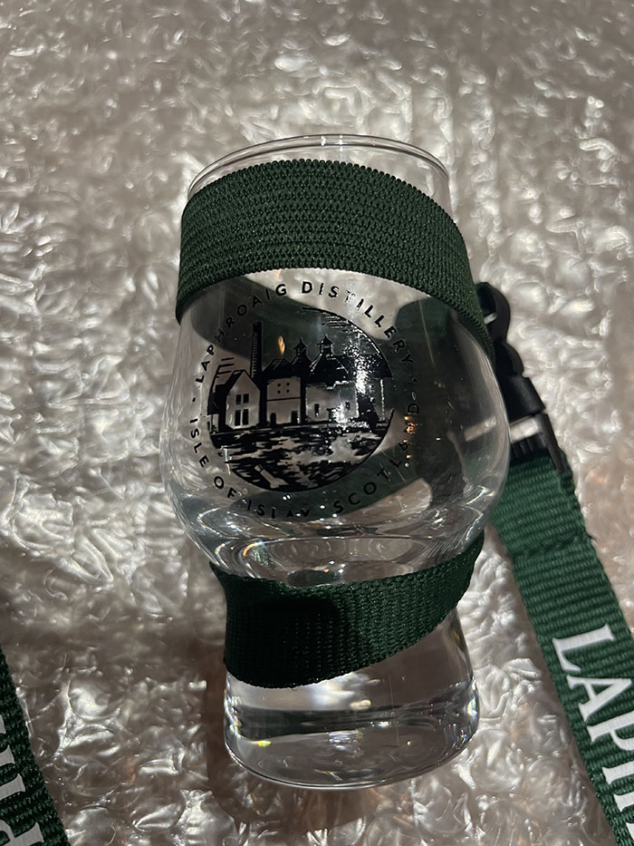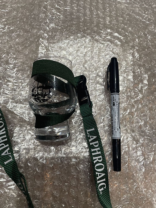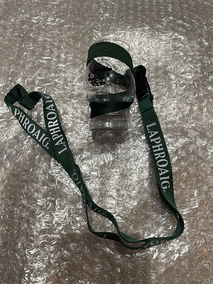 laphroaig(ラフロイグ)ストラップ付き ディスティラリーが黒でプリントされたグラス