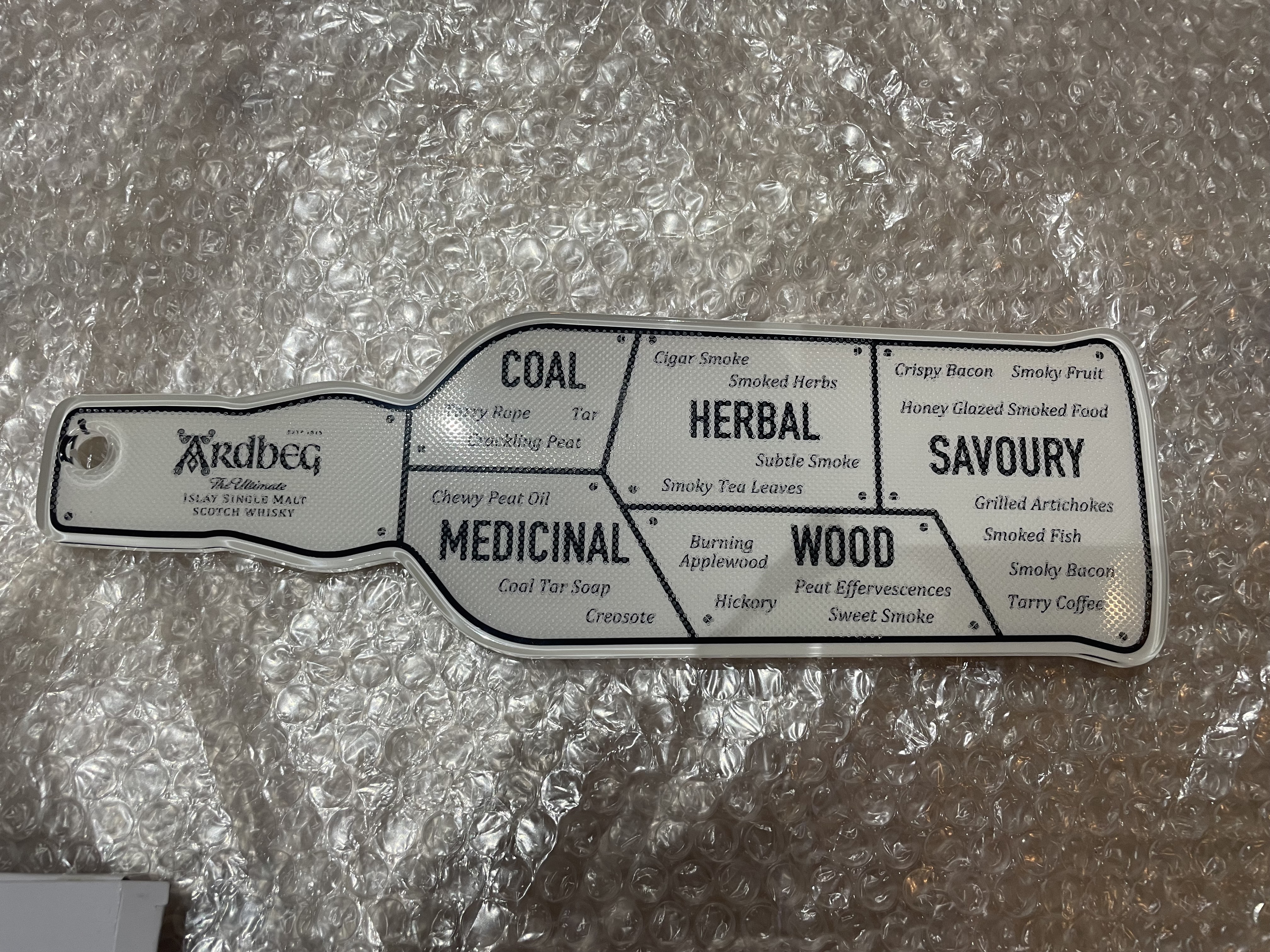 アードベッグのボトル型まな板です。 サイズは約横29.5cm、縦9cm ボトルの先の部分に1cmほどの直径の穴があって釣れるようになっています。
