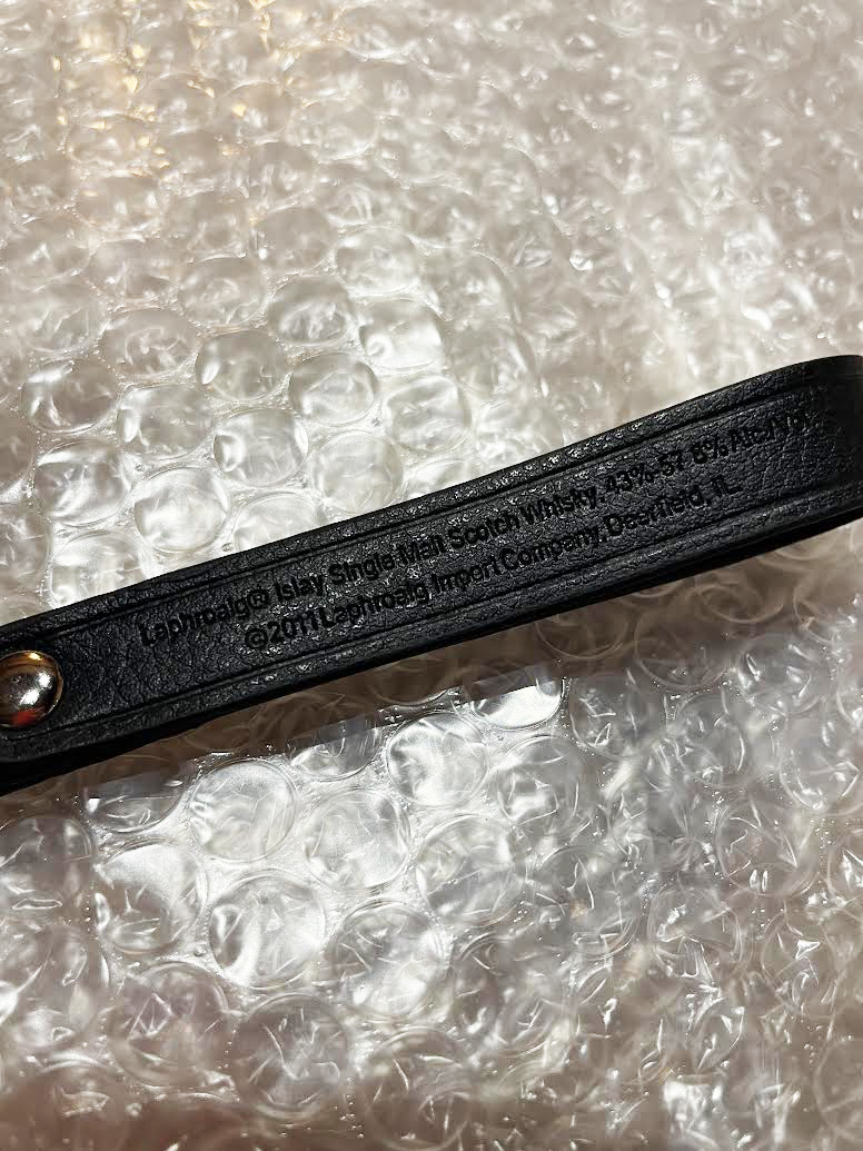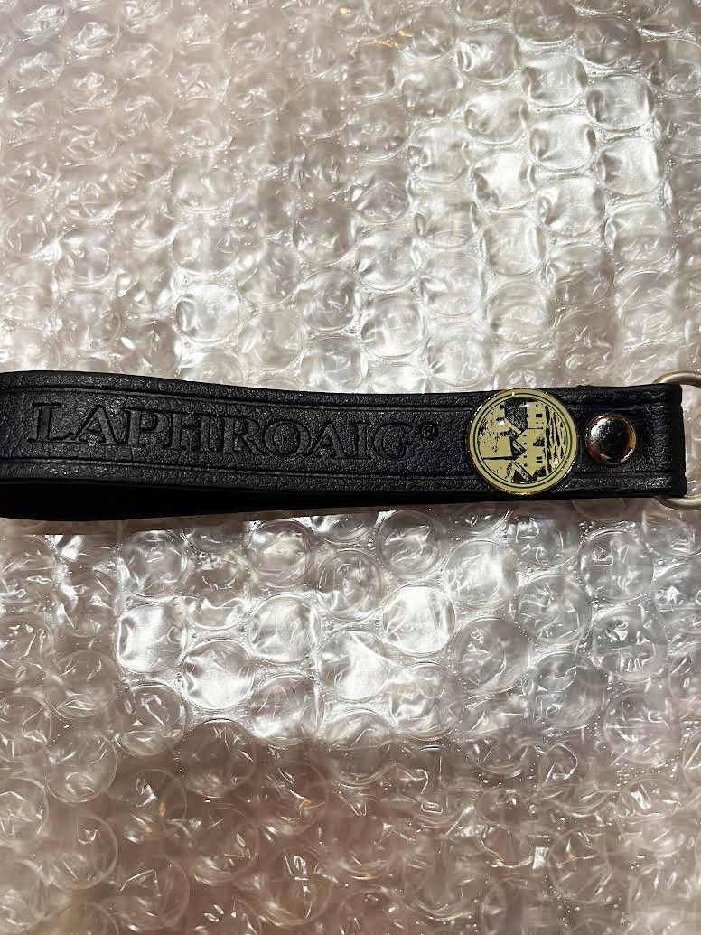 ラフロイグのキーリングです。 丸の部分に蒸留所の模様と、ストラップ部分にはエンボス加工でネームが入っています。裏面もエンボス加工で表記がございます。