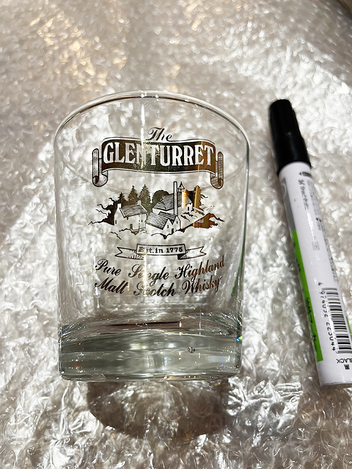グレンタレットのグラスです。 蒸留所の風景とロゴが金にっています。