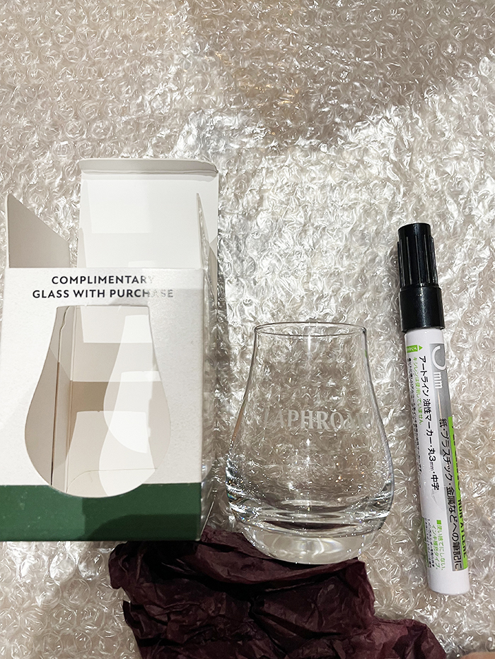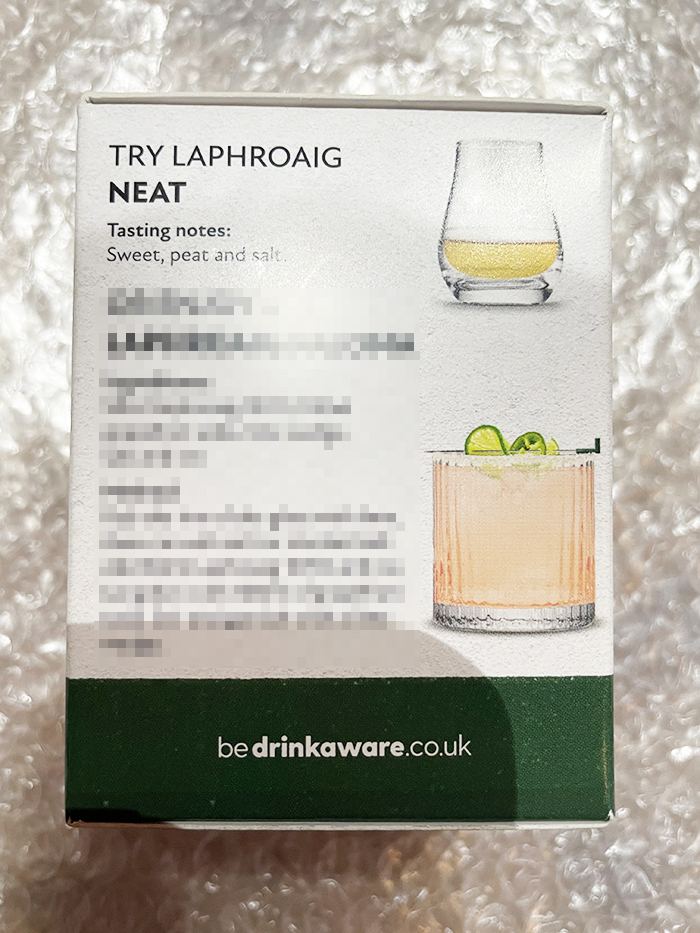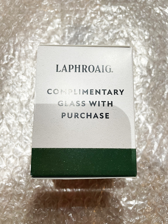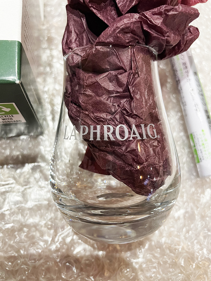 ラフロイグのロゴがエッチングで表現されたグラスです。 ケース付きで、ケースにレシピが記載されています。(レシピはご購入者の方は見られます)