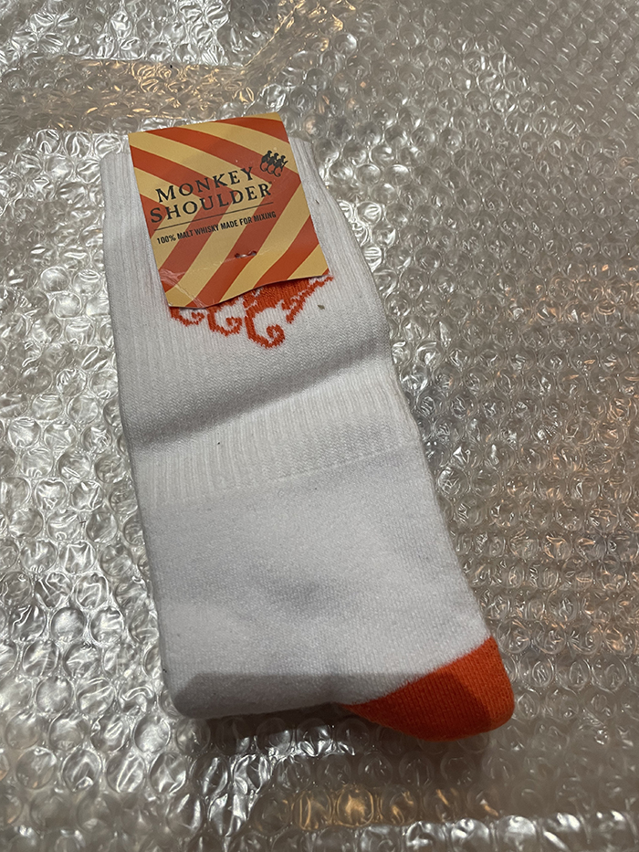 MONKEY SHOULDER(モンキーショルダー)の靴下です。 オレンジ色と白のツートンでフリーサイズです。